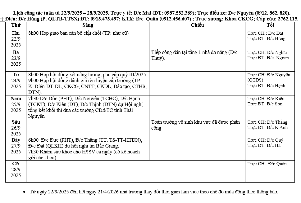 Lịch công tác tuần từ 22/9/2025 – 28/9/2025.