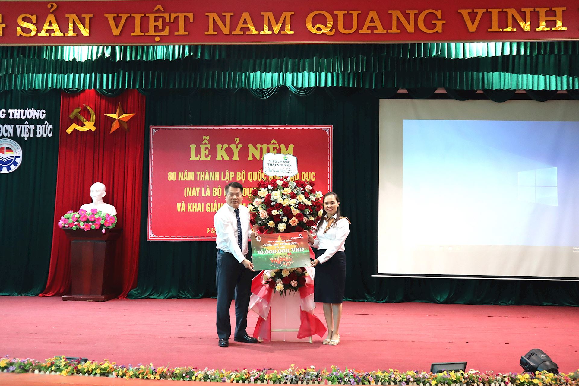Đại diện Ngân hàng TMCP ngoại thương Việt Nam chi nhánh Thái nguyên tặng hoa chúc mừng và trao quỹ học bổng “cùng em tiến bước” trị giá 10.000.000 đồng cho nhà trường.
