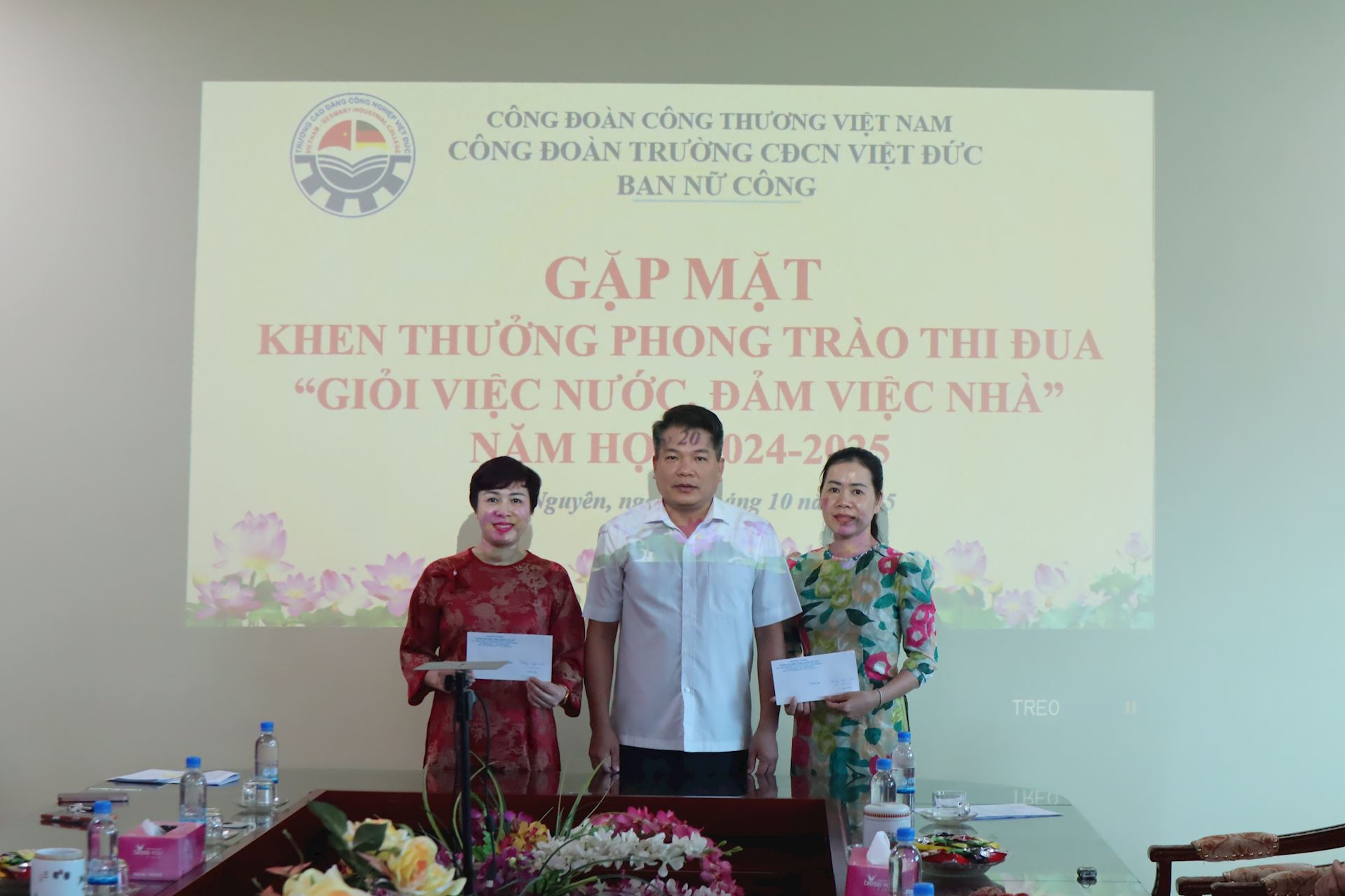 Đồng chí Trần Minh Đức - Phó hiệu trưởng, trưởng ban vì sự tiến bộ của phụ nữ trao thưởng cho 2 cá nhân nữ công có thành tích xuất sắc.
