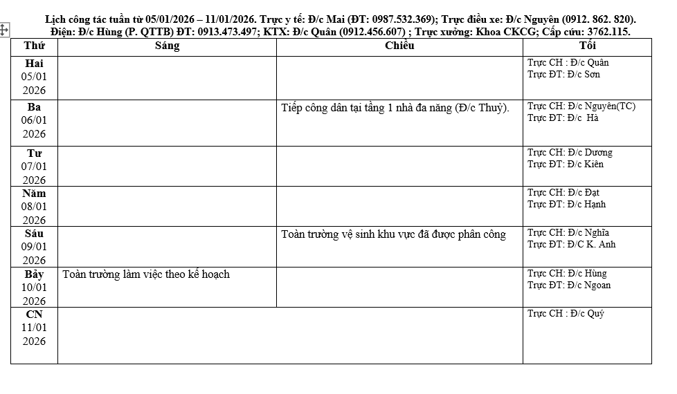 Lịch công tác tuần từ 05/01/2026 – 11/01/2026