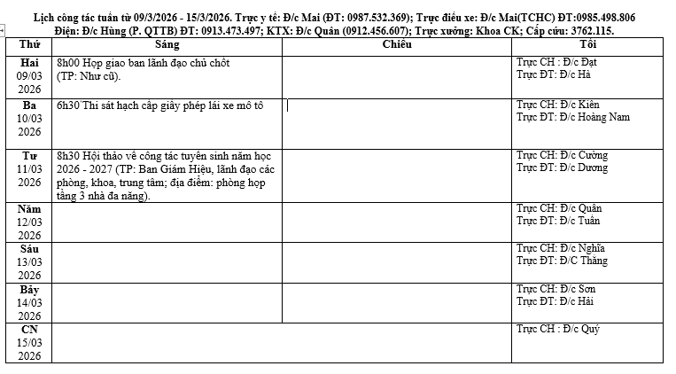 Lịch công tác tuần từ 09/3/2026 - 15/3/2026