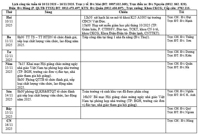 Lịch công tác tuần từ 10/11/2025 – 16/11/2025