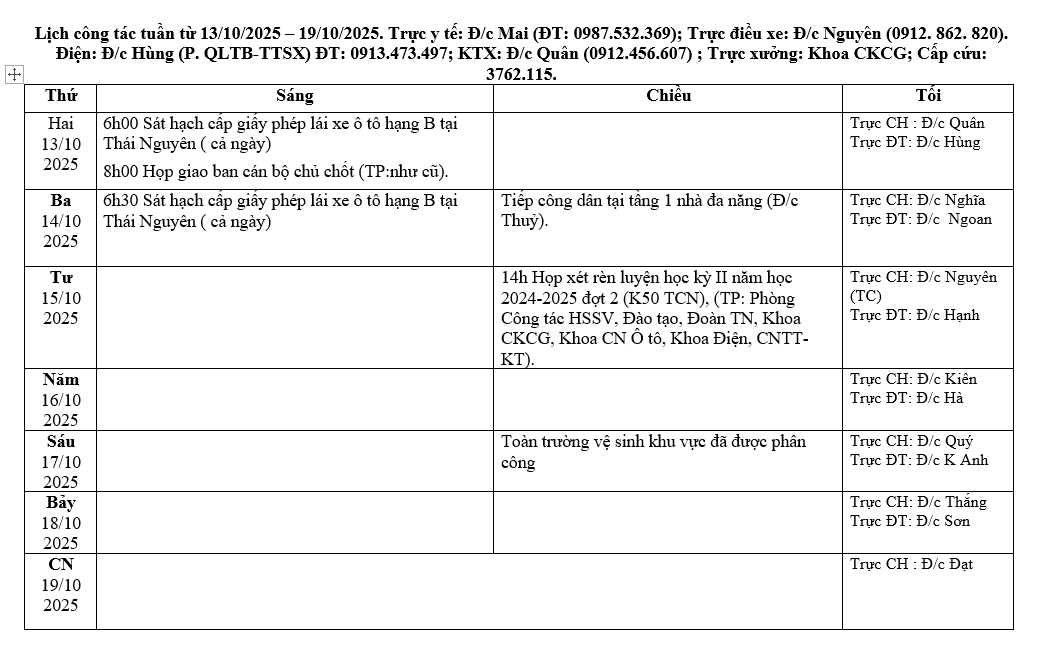 Lịch công tác tuần từ 13/10/2025 – 19/10/2025