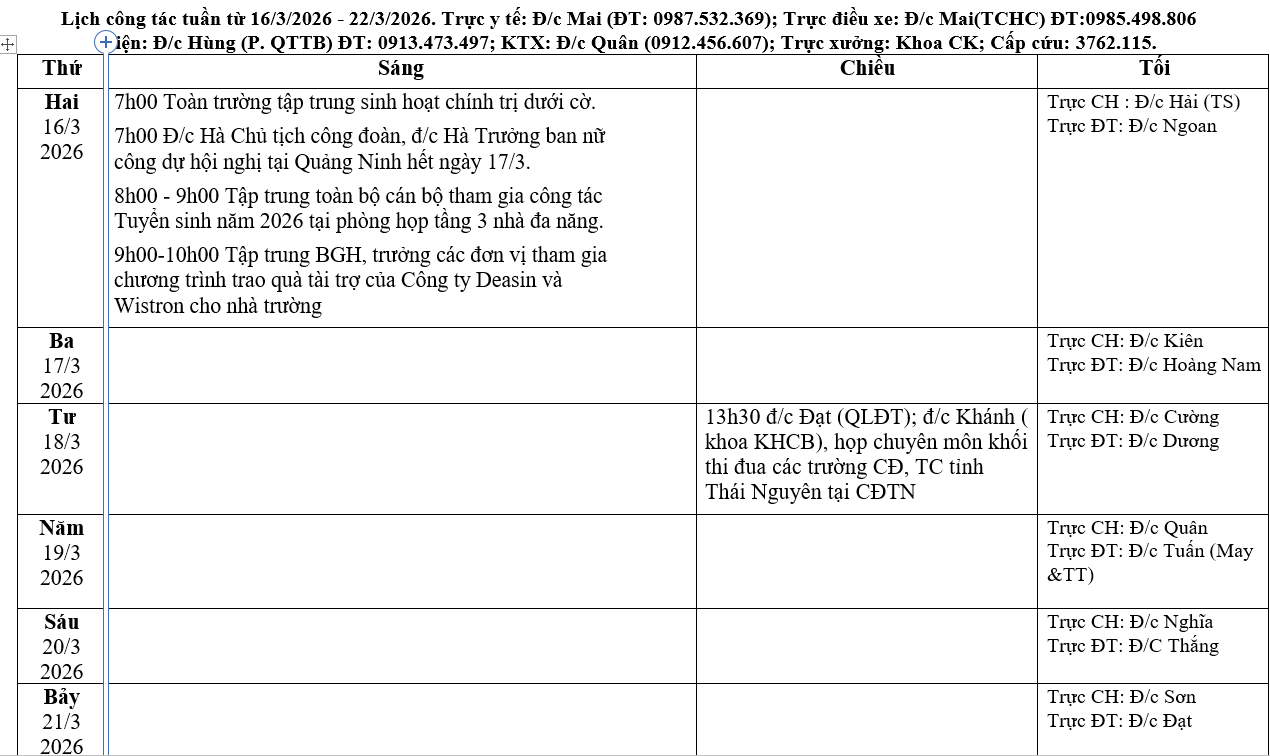 Lịch công tác tuần từ 16/3/2026 - 22/3/2026.