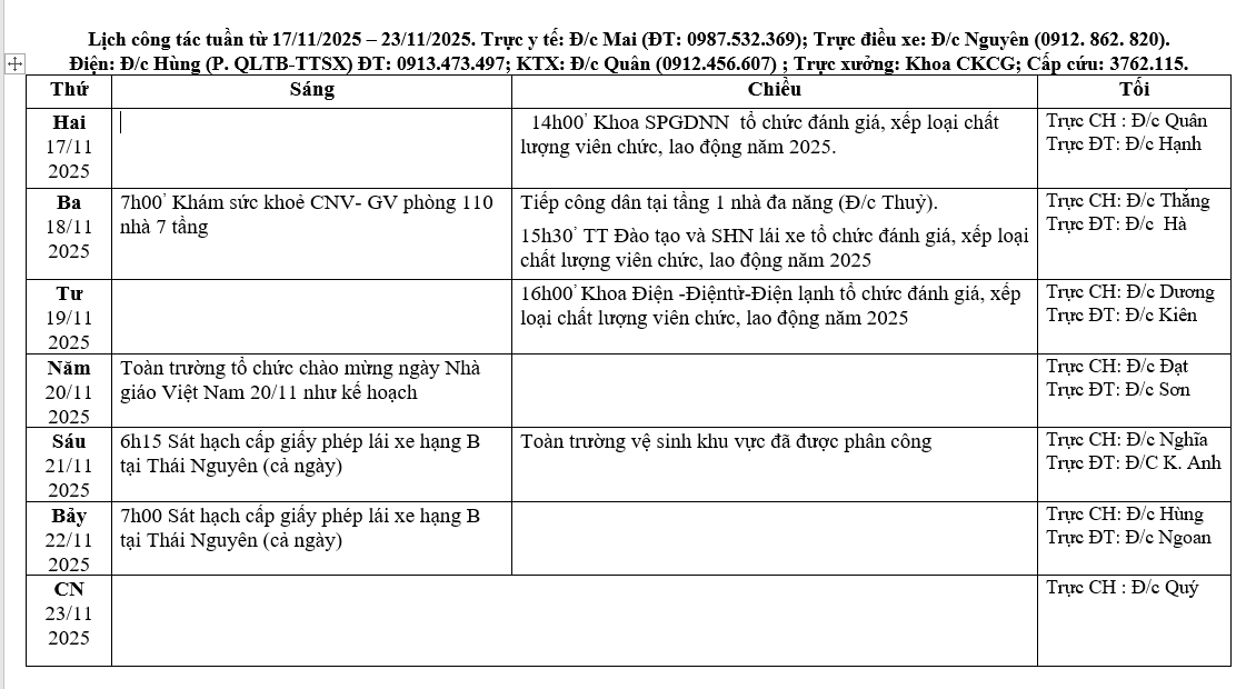 Lịch công tác tuần từ 10/11/2025 – 16/11/2025