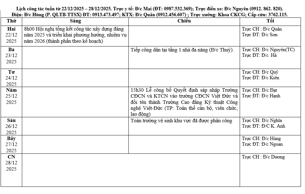 Lịch công tác tuần từ 22/12/2025 – 28/12/2025