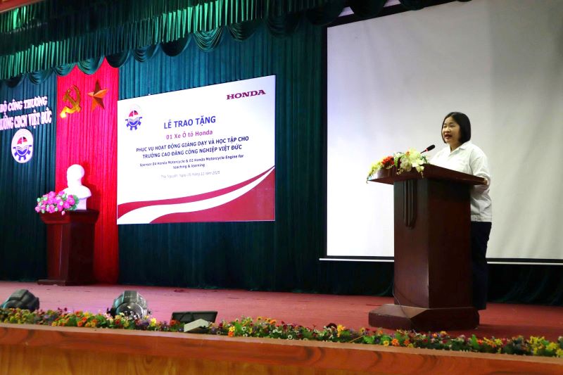 Bà Nguyễn Kim Thoa, trưởng phòng Hành chính Honda Việt Nam (chi nhánh Hà Nam) phát biểu tại buổi lễ và thực hiện nghi thức trao tặng xe ô tô cho trường CĐCN Việt Đức